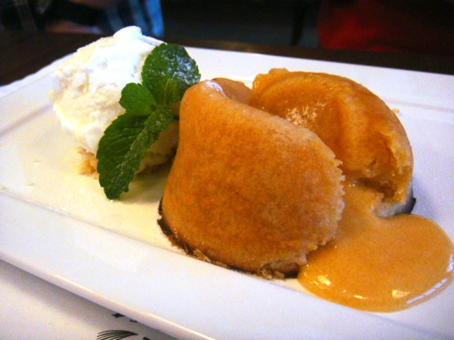 De sobremesa, não poderia faltar um belíssimo doce de leite! A escolha foi o petit Gateau de doce de leite com sorvete de tapioca! Vale a caloria! Experimente!